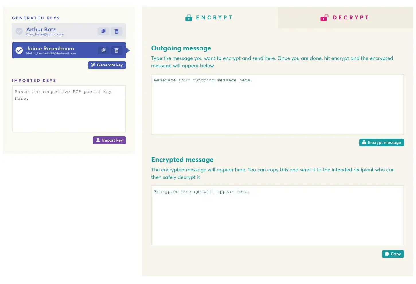 使用 PGP 加密消息是行业标准。 每个人都有私钥和公钥。 您的私钥需要保密,因此只有您可以阅读消息。 您的公钥会分发给任何想向您发送秘密加密消息的人。 管理密钥、加密消息和解密消息应该是一种流畅的体验。 EncryptEasy 就是要让它变得简单。